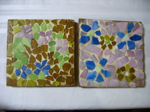 Make a tile mosaic--Although the sample mosaics shown here are flowers, so only subtly reflect the joy of new life in Christ, it can be a more direct depiction of the last week of Jesus’ life, if the picture depicts a scene from the last week. The special thing about mosaics is that it was an art form that was used in the Roman empire during Jesus’ time. I bought glass pieces at a craft store and gave them to my children to glue onto squares of plywood. After the glue died, we spread grout between the glass pieces. We have used these trivets almost every day for the last 10 years. Many 100 yen stores sell tiny colored tiles, and if you can’t find any there, hardware/home improvement centers sell bigger tiles--buy tile nippers to cut the tiles to fit the design. If these materials are not available to you, you can still make mosaic pictures using squares of wood chips or paper, sheet magnets cut into shapes, or even crushed eggshells left over from dying real eggs.