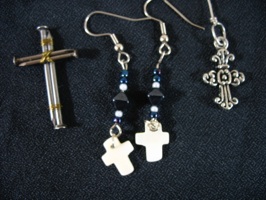 The cross on the left is made by wrapping brass wire around 4 nails. The earrings in the middle were made from beads purchased at hundred yen stores. I also found the cross earring on the right at a hundred yen store.