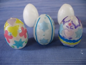 Paint a wooden egg--you don’t have to worry about it breaking, and no one will know it’s not real, unless you tell them. I bought the one on the left at an American craft store. I also bought egg-shaped wooden boxes at a 100 yen store, so keep your eyes open. Some stores will order things for you if you want a bunch.