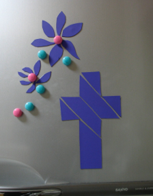 Make a cross puzzle. If your child knows how to use woodworking tools, he or she can make one out of wood. If they know how to use scissors, they can cut one out of EVA foam, or a sheet magnet, and display it on the refrigerator. An even easier method is to cut the pieces out of light weight modeling clay such as Hearty (Karui Kaminendo, sold at 100 yen stores). If the pieces aren’t perfect, don’t worry about it, you can trim them with scissors after they have dried. The pieces could also be cut out of thin cardboard such as cereal boxes. But making the puzzle may be easier than putting it together once it is finished! This looks simple, but it is really hard to figure out how to make a cross out of the pieces provided. So if your children know the trick, and adults can’t figure it out, they feel smart. If you put it away until the next Easter, your child will probably forget the trick, and have to figure it out all over again, so it’s almost as good as making a new puzzle.