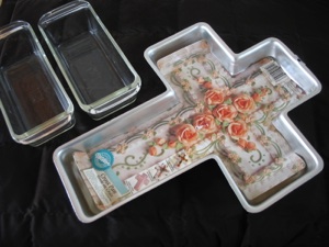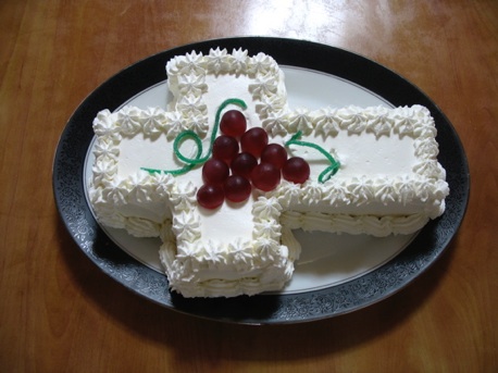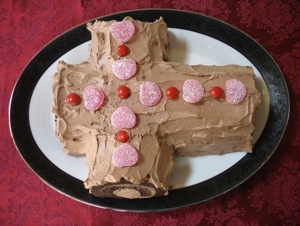 Step 1: Buy 3 cakes and line them up on a plate like a cross, cut one in half for the cross pieces (pound cake and Swiss rolls work)