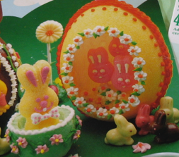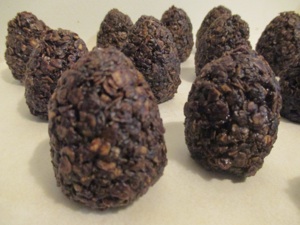 Melt margarine and marshmallows and mix in any kind of unsweetened cereal. Rice Kripies is the usual choice, but plain cornflakes work well. Press into an egg shape with your hands and leave to cool and harden. Dribble with melted chocolate and sprinkles, or completely coat with melted chocolate and decorate. Poking a skewer into them makes it easier to get the chocolate all the way around the egg, and also allows the chocolate to hardened without sticking to a plate.