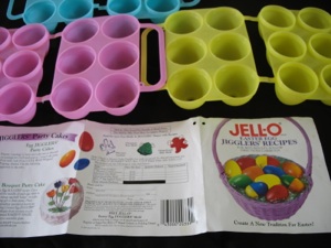 Make jello with half the amount of water called for in the instruction. Close the molds and pour the mixture into the egg molds. If you want to have two tone eggs, pour in half full, then harden before filling the rest of the way with another color of jello.