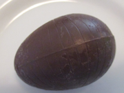 Melt white, milk, or dark chocolate and pour into half of the mold. Put in the refrigerator to partially harden. When the edge has hardened, pour the still soft chocolate from the middle into the other half of the mold. Put both halves into the fridge to harden. Pour out the soft center of the second half leaving a shell, and return to fridge to finish hardening. When the chocolate looks cloudy through the plastic, pop out of the mold. If you want to put a surprise in the egg, now is the time to do it. Melt chocolate and put a thin layer along the edge and put the two halves together and harden. Decorate as you feel inspired.