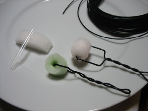 A fun way to make designs on eggs is to make rollers, and roll the strong dye onto the eggs. This is not nearly as complicated as it sounds. Cut strips of sponge, glue a plastic straw to the middle of each strip, then trim the ends and glue them together. (A glue gun makes an immediate bond.) Then bend a wire to form a handle. It really only takes about 5 minutes to make one, if you have the supplies on hand. Make a roller for each color, or just rinse out when your kids want to paint with a new color.