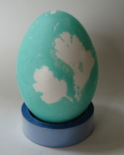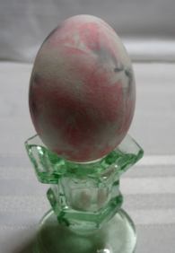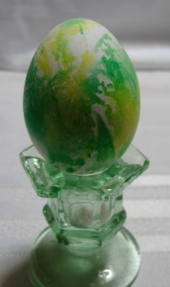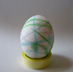 One of the easiest ways to get a wild design on the egg is to put dots of strong dye on a small piece of damp cloth, then wrap it tightly around the egg--using plastic wrap to keep your hands clean, of course. Each time you open the cloth, a totally different design emerges. You can use the cloth on a second egg for a lighter version, then you need to add more dye for the next egg. To get the dye on the cloth, stick a straw into the dye, put your finger over the other end of the straw, but don’t let go until it is over the cloth, or you will have a mess to clean up! DO NOT tip the straw, or the dye can dribble out before you are ready.