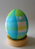 Decorate your egg using cotton string. Tape both ends to form handles, and get it wet before you dip it in the strong dye. Then let the kids wrap the string around the egg any way they want.