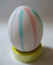 Dribbling drops of dye over the egg can create interesting designs. You never know exactly where the trickle is going to go--sometimes straight, and sometimes curvy. Just use a straw to pick up a few drops of dye by dipping the end of a straw into the dye and putting your finger over the other end. Move the straw over the egg, and when you take your finger off the straw, the dye will pour out over the egg. DO NOT tip the straw, or the dye can dribble out before you are ready. Keep the dye in the container shallow so that not too much dye can be picked up at a time.