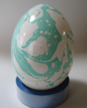 Pour a few drops of oil on the surface of the dye bath, and mix it with a spoon just before you drop an egg in. The oil swirls will protect that part of the egg from the dye, and will form a swirly pattern on the egg. After you pull the egg out, wipe the oil off with a dry kleenex.