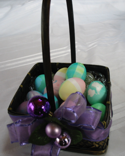 Another way to add designs to dye bath eggs is to coat flowers and leaves in oil, stick them on the egg, then slip the egg into the toe of a stocking and tie it shut. Dip the whole thing in the dye, and when you take off the stocking and leaves, a stenciled image will remain.