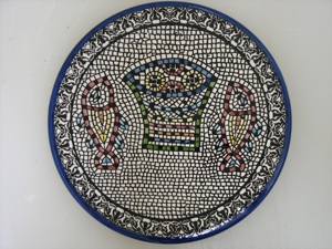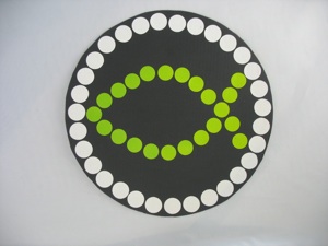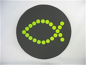 Imitate this mosaic plate that looks like a mosaic found on an ancient Roman floor. Provide black paper plates, or black construction paper circles (the smaller they are, the less time they will take to make!) Make a sample that the kids can follow, and simplify it to make it a quicker project--only one fish, use bigger stickers, or don’t fill in the empty spaces. Provide several colors of dot stickers found in office supply stores and dollar stores. Draw an outline of the fish so the kids know where to put the stickers. If they do fill in the spaces, there will be some spaces that are not big enough for whole stickers. Encourage the kids to overlap dots that are the same color to fill these spaces rather than cutting the stickers to fit.