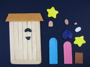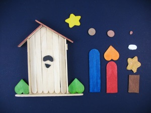1.Joseph: half a tongue depressor for the body, circle face, point of a star for the beard, 2 points of the star for the mustache ( which are both on the barn since the background was too dark for them to show up) The beard and mustache are so small that you can color them black with a permanent marker instead of paint, if that is easier.