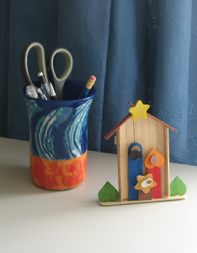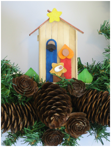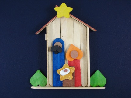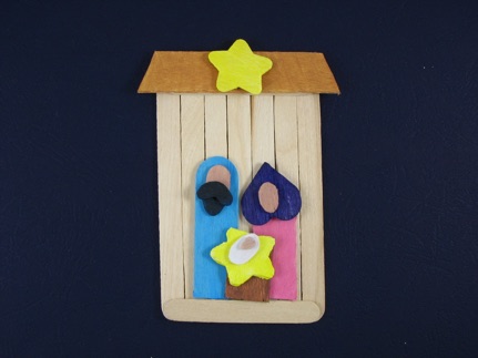 3.Baby Jesus: a short section of a tongue depressor for the manger, a star for the straw, an oval for the body, and a tiny oval for a face.