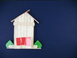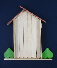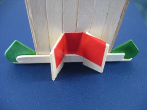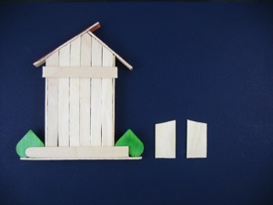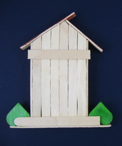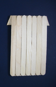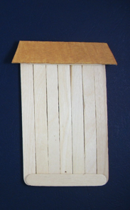 Line up 7 popsicle sticks (or however many it takes to be the same length as the short popsicle sticks.) Use a ruler or book to make sure the 7 sticks line up evenly. Glue on 2 shorter sticks as crossbars to hold all the sticks together--glue one at the bottom, and the other at the top, but this one should be a fraction of an inch away from the top edge (it is hiding under the roof in the photo.) When the roof is glued on top, it will be at a slight angle. See below for how to cut the tongue depressor for the roof. If you can’t get tongue depressors (double wide popsicle sticks) use a regular popsicle stick instead.