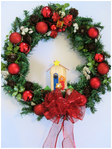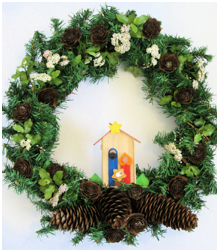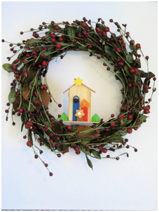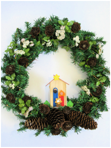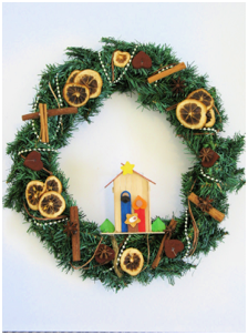 To make a natural wreath, buy a plain artificial wreath. Use a glue gun or florist’s wire to fasten on natural items such as stick cinnamon, star anise, and dried lemon slices. Twist on a string of gold beads for a bit of sparkle, if you like. For another option, instead of dried fruits and spices, make wise men and shepherd figures to scatter around the wreath.