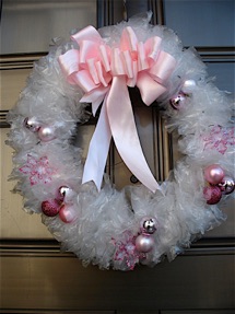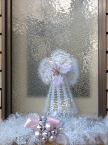 The interesting thing about these pink and white decorations is that the wreath and swags are made out of clear plastic bags--just cut them into rectangles (the family fun website where I discovered the idea, suggests using sandwich bags) and tie them to a coat hanger in knots. Bend a hanger into a circle for the wreath, and in straight lengths tied together for the swags. This is easy, and cheap, but rather boring to make, so you may want to do it as you watch T.V. It is definitely not a project kids would enjoy--they might tie 3 or 4, but then they will be ready to move on to something more interesting. I forget if the wreath took me one or two hours to finish. The crocheted angel inside the window blends well with the plastic bag swag on the outside.
