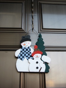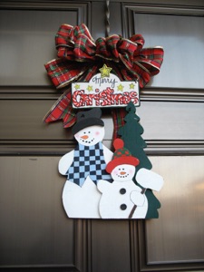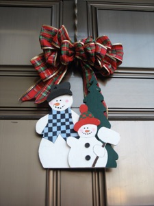 Even though these snowmen are about the right size for a wreath substitute on the door, it seemed too small and plain by itself. I tried adding a red bow, and that helped, but it didn’t seem to be enough. When I added the “Merry Christmas” sign, that finally seemed to make it “good enough” to decorate my front door.