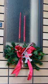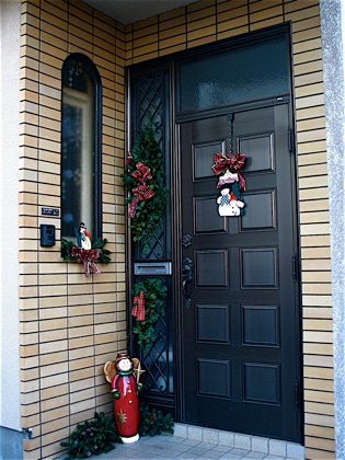 Here are two ways to combine the inside decorations with the outside when decorating a window. The one on the left has a dollar store birdhouse, and the one on the right has dollar store candles. The swag, as in the photos above, is a hundred yen store tree turned on it’s side with a bow and painted wooden gingerbread man and mints.