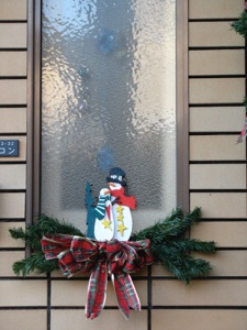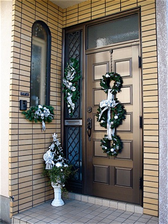 I made this swag from two small Christmas trees (from hundred yen stores). Pull off the legs and fasten the two center poles together in the middle with florist’s wire in two places so it doesn’t wobble. Add a big bow in the middle. I added pine cones with florist’s wire and tucked in some holly leaves and berries. For a more luxurious version, add red, green and gold balls and snowmen ornaments.