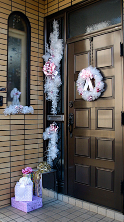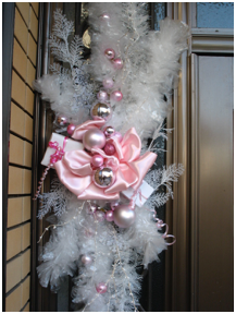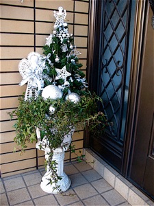Many craft stores sell ready made swags as well as plain swags. I made this swag from two small Christmas trees (from hundred yen stores). Pull off the legs and fasten the bases together in the middle with florist’s wire in two places. Add a big bow in the middle. I added pine cones, silver balls and white “greenery” with florist’s wire. view how to make a bow