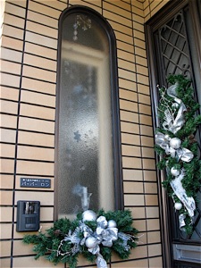 The swag under the window is also a sideways hundred yen Christmas tree with matching silver and white decorations. I fastened it on with a short tension rod. The candle and snowflakes hanging inside the window blend with the decorations on the outside.