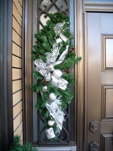 Hang 3 wreaths on the door for a dramatic affect. I bought plain wreaths and added pine cones that I picked up off the ground, and silver balls and white “greenery” from a dollar store. I used florist’s wire cut to short lengths to fasten them on. The wind tended to blow the wreaths around, so I taped the ribbon to the door near the bottom wreath.