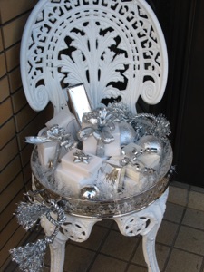 I borrowed this wrought iron chair from a friend. I was worried that I might not be able to open the door, but it fits beside the door, amazingly enough! A table would work just as well--just make sure it’s pretty. The chair has small gifts wrapped in silver and white with a few silver balls tucked into any empty places. A tray keeps them from falling off the chair.