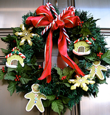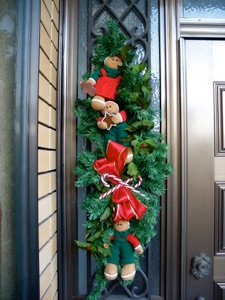 These candy canes and felt gingerbread men were purchased at a dollar store. They are fastened to the swag with florist’s wire. Holly leaves and berries were added to vary the greenery.