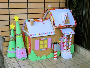 A gingerbread theme is sure to please kids. This gingerbread house was made out of cardboard boxes and foam decorations. The wreath and swags are decorated with dollar store candy canes and gingerbread ornaments that I fastened to plain a wreath and swag with florist’s wire. You can make your own gingerbread ornaments with cookie cutters and air drying clay such as Hearty (karuikaminendo sold in 100 yen shops.) Many dollar stores sell foam sets around Christmas, some of them being gingerbread men. Another option is to make gingerbread men out of corrugated cardboard, or cut the shapes out of wood, and paint them. Craft stores that sell plain wood shapes for crafts often sell gingerbread men and gingerbread house shapes quite inexpensively. If you sew, make them out of felt, and if you cook, make them out of real gingerbread, but bake them extra hard.