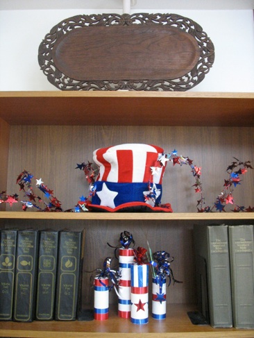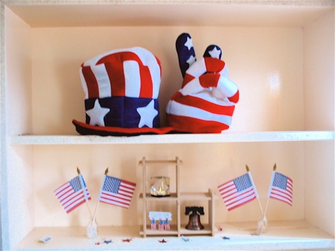 Here is another variation of decorating with hats and flags. The flags are standing in small glass bottles. The shelf holds smaller items, such a fire cracker pin purchased at a craft store, and a liberty bell purchased at the Smithsonian souvenir shop. You can make your own liberty bell out of a Pringle’s potato chip can.
