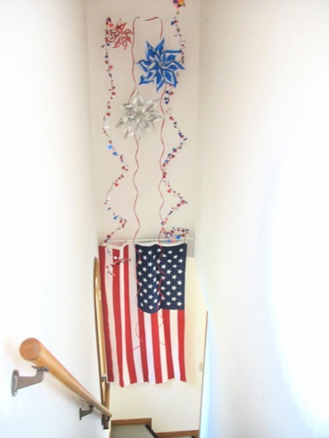 Big flags can decorate large areas. If you don’t feel comfortable flaunting the American flag outdoors, use it to decorate indoors. I hang this one in our stair well, and embellish with star garlands, and large stars made from origami paper. Check out the Family Fun website for how to make them.