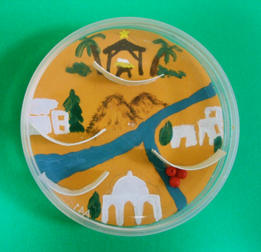 Bead mazes can be SO infuriating because you can never get all the little beads to go where you want them to go, and even if you get one to go where it is supposed to go, when you try to get the others to go there too, the first one rolls out! Anyway, here is a simple way to make your own infuriating game! The game in the photo has a Christmas theme--the wisemen looking for the baby Jesus, so the beads start in the east (the bottom) and travel to bethlehem where the star hangs over the manger at the top. Make background scenes to fit any Bible stories that you are teaching, that involve travel, or let the boys make up their own designs. The ledges that help the beads along the way are small pieces cut from toilet paper tubes. The bead game shown in the photo is fairly simple with only 4 ledges, but you can make it more complicated with more ledges, or make straight mazes with strips of thin cardboard.