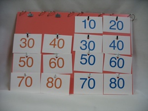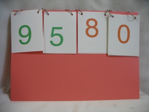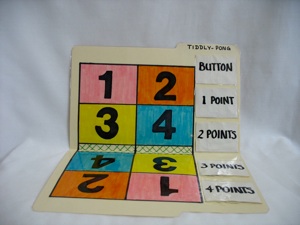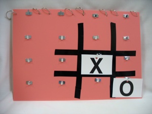 This board is good for Tick-Tack-Toe, True/False, and a Jeopardy-style game (see Printable board games and Non-board games for details.) It is also useful for score keeping in 2 ways--either put score cards on the hooks and let each team get their score cards as they answer questions correctly, or put score cards on rings and flip them to the right score. Sure, you can just write the score on a white board, but isn’t this way a lot more fun?
