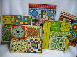 Buy a large spiral bound sketch book. Print out game boards and glue them to the pages. Cover with clear plastic sheets (contact paper) Find cute pictures to be the playing pieces and cover them with contact paper as well. Glue envelopes to the inside cover of the sketch book to hold playing pieces. If you have a small group, you could use photographs of the kids as playing pieces.