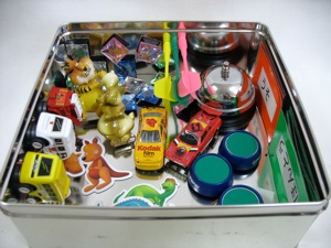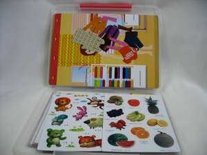 Metal boxes that cookies or cracker come in make good storage containers. Plastic boxes from 100 yen stores can be used, too, but be sure to use metal cookie sheets or something made of metal to stick the magnets on. If you don’t, they will lose their magnetic strength. Some magnets come in sets with a board to stick them to--these work well for storage--front and back. (see photo below)