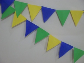 For more decorations inspired by the flag, cut green, yellow, and blue paper into triangles, punch holes on two corners, and put string through the holes and drape them around the room to make the room look festive.