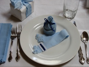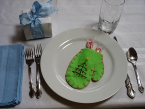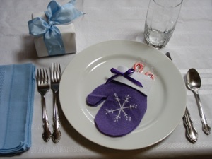 Cute little hats and scarves continue the snow theme on each plate. They are so easy to make. Cut the scarves out of narrow strips of felt or fleece. Glue on smaller strips of felt for a design element near each end, and cut a fringe on both ends of the scarf. The cool thing about fleece is that if you gently pull each fringe strip, they curl up. If you want to make the scarves into place cards, use fabric paint to write the names.