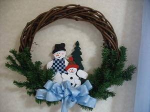 Keep the snowman theme going through the whole room with a snowman wreath on the wall. To make one like this, Make or buy a vine wreath. Sometimes you can find these at dollar stores. Buy unpainted wooden snowman cut outs at a craft store and paint with acrylic paints. Fasten a bow and artificial greenery to the wreath with florist’s wire.