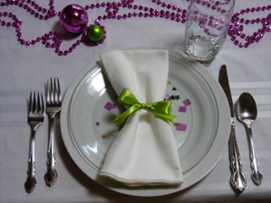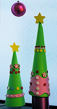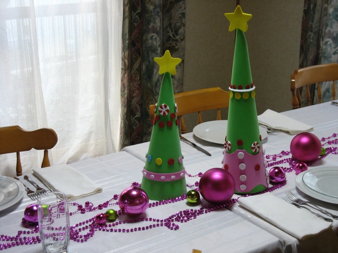 Sometimes it is fun to play around with the customary Christmas colors--exchange hot pink for the typical red, and lime green for the usual dark green, especially now that so many colors of decorations are available. Pictured here are strings of beads and Christmas balls that are draped along the middle of the table like a three dimensional table runner (from a dollar store, of course). If you don’t want to use tropical colors like the ones shown here, use the same design elements (foam trees, Christmas balls and strands of beads) in any color combination that you want--it will still look great. The Christmas trees are quite easy to make. Buy a large sheet of EVA foam or poster board for each tree, and roll each into a cone. Glue it in place, and cut the excess off of the bottom so it stands upright. Then cut out candy shapes from other colors of foam and glue them to the trees. Glue guns work great with foam. Another option is to buy packs of pre-cut foam shapes, that often come with adhesive backing. These make it a super quick project. Decorating the trees could be part of the entertainment for the children who come for dinner. Hint: if you don’t have quite enough foam when rolling the tree into a cone, so there is a hole on one side of the bottom edge, glue a wide band of another color of foam on top of the green layer to hide the hole. Another trick to make one tree a little taller than the other one is to put the finished tree on top of an empty ribbon spool. Cover the cardboard spool with a short length of ribbon, or cut color coordinated paper to fit (see photo on right).