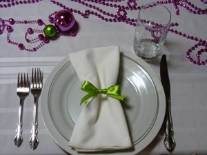 Tie a color coordinated ribbon around a napkin for a simple napkin ring that blends in with the rest of the decorations. You could string some Christmas balls to the ribbon before tying the bow for a more festive touch.