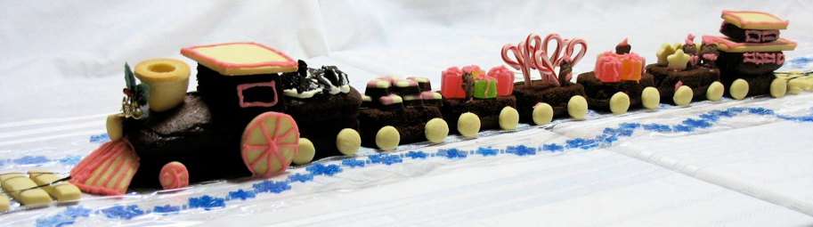 A train you can eat--it is sure to please any child! If you want the train to look fabulous, you better make it yourself. If you want it to be a fun activity, let the kids join in to make it (Don’t expect it to look very good. But who cares? If you want the kids to have fun, you can’t go wrong making it together! Just don’t use a tablecloth!) If you buy all the parts to assemble, the drawback is that it gets expensive. If you make everything yourself, obviously, it takes a lot of time. The other option is to do some of both--bake some and buy some. In the photo above, I baked chocolate cake and sugar cookies for making the train, then bought candy to fill the cars. You don’t have to make a cake chocolate, but it is a great color for the engine. So if you can make cupcakes and sugar cookies, you can make this train. If not, you can still make it--just buy baked cake and different sizes of cookies.