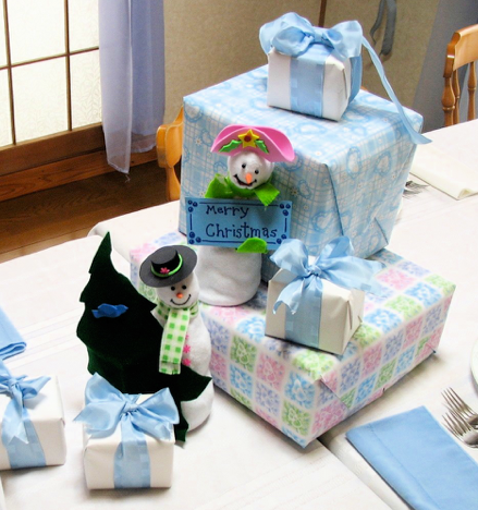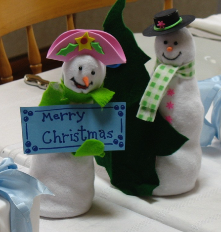 Make a centerpiece with a couple of cute snowmen. If they seem a little too small by themselves, put them on top of a stack of color-coordinated gift boxes. Make your own snowmen out of a pair of socks (from a dollar store, for the cheapest option.) Stuff them with empty plastic shopping bags (good way to recycle!) Wad them into 3 balls, each one bigger than the next by wadding up more than one bag to form a bigger ball. Push the smallest ball into the toe of each sock to form the head. Then push in the other two “balls” to form the middle and large balls. Push in a jar lid to form a bottom for the snowman to stand on. Glue the opening of the sock closed. If there is too much excess sock, stuff with larger balls, or cut off the excess. Now use details to transform the stuffed socks into snowmen. Tie a ribbon or strip of felt around the neck to make a scarf. The pink hat is a doughnut shape cut out of EVA foam that has been folded in half and glued in place. The black hat is a doughnut shape cut out of foam or cardboard for the brim, and a black bottle cap for the top. The eyes and buttons are beads. Make a carrot nose out of foam or felt. Draw the mouth on with a fine tipped permanent marker.