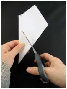 Cut the remaining triangle at an angle. The sharper the angle, the “pointier” the star will be. The part held by the left hand is the part that is the star. Open it one fold to make sure you didn’t cut too far up, since the inside folds are not as tall as the outside. If you missed some layers, fold it back up and cut the angle a little shorter (closer to the point.)