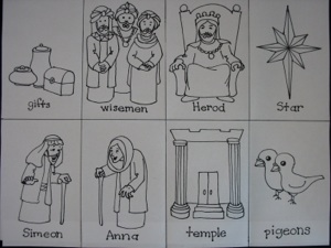 The object of the game is to collect all 4 cards from one of the 4 Christmas accounts--1) Jesus’ birth, 2)the shepherds were informed, 3) the wisemen bring gifts, and 4) Anna and Simeon see Jesus in the temple. (each row of pictures on the downloadable sheets is one set of 4 cards, for a total of 4 sets.) Deal 4 cards to each child. Put remaining cards in a pile face down on the table. Turn the top card face up to begin the discard pile beside it. On each turn, one card will be collected, and one card will be discarded. The first person to collect 4 cards of one set, wins. There are three ways for a player to get a card--the player can ask any other player for a particular card, or, can take the face up card, or can take a chance with the top card from the face down stack. After getting a card, the player discards one card in the face-up pile, and the next person takes a turn.