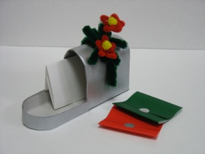 This advent calendar is in the shape of a mailbox that really opens and shuts. It is made out of a kleenex box with silver paper taped to the outside. There are many ways they can be decorated, but the two ways shown here are felt holly leaves and pipe-cleaner (chenille wire) poinsettias. Put 24 “letters” in the mailbox, and it becomes an advent calendar. Cut colored paper into strips and let the kids fold them and seal them with stickers. Be sure to have them write the numbers on the outside of the letters in descending order as a countdown till Christmas. Each day they can read another “letter” and see how many days are left till Christmas.