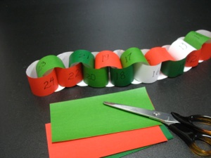 Another option: rather than cut strips of colored paper, photocopy a picture for each child. Cut the pictures into strips for the children to make into rings in a chain. When they cut off each ring and tape the strips together, they will have a complete picture by Christmas. You could give a prize for each child who can guess what the picture is before Christmas. This should not be told out loud, or it will spoil the surprise for the other children who haven’t finished the puzzle yet.