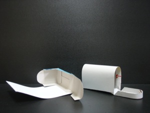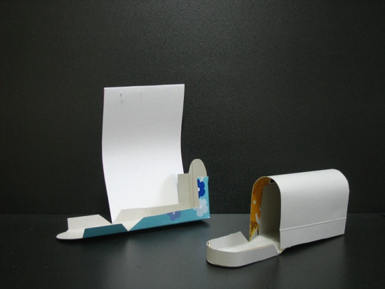 3.Cut the back side off of the rest of the box so it is the right size to fold over and form the domed roof of the mailbox. Either glue or staple it to the base of the mailbox (end of the kleenex box.)