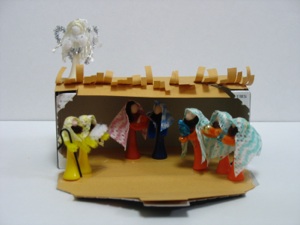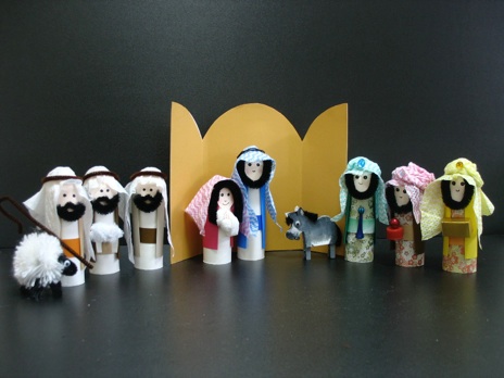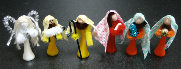 Buy wooden blocks ( sold in craft stores ) and Hearty (sold in craft stores and Walmart.) Make the body from a big cone shape, and arms from small cone shapes. Head and hands are ball shapes. Heads tend to fall off, so it is best to secure them with a toothpick (stick it all the way in so it won’t show.) Headdresses are flattened balls. Hair is clay cut into strips. Make the baby by wrapping a bead in felt. Draw faces with a fine tipped marker.