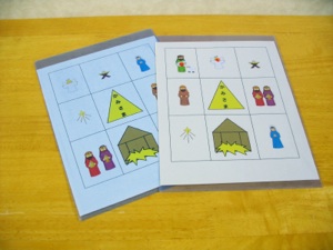 These Bingo cards are made with Nativity stickers ordered from the Oriental Trading Company. You can make your own by drawing pictures or getting pictures off the internet. Put them in plastic sleeves so they can be used over again. Use it to help children listen during the story, or as a review game. Link to Oriental Trading.com