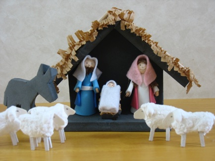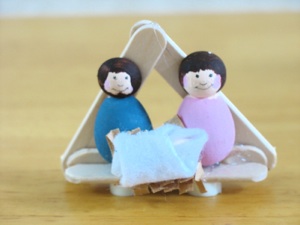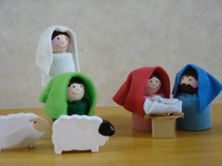 This set is small enough to make into a pin. The people are made out of wooden bee bodies, the stable is cut popsicle sticks, and the baby is a bead wrapped in felt. Buy supplies at craft stores.